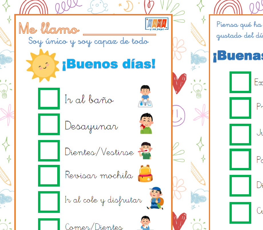 En este fichero encontrarás las rutinas para el día (ir al baño, desayunar, vestirse,… ) y las de tarde-noche (extraescolares, deberes, cenar, cuento…).